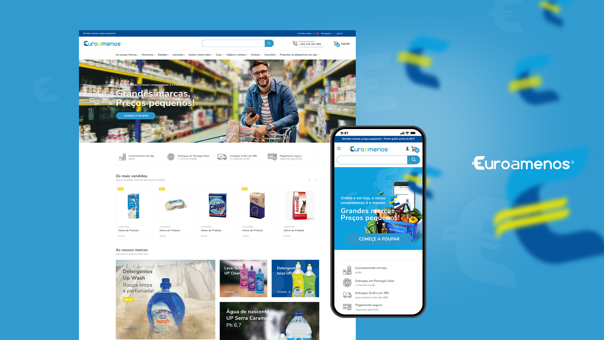 Em euroamenos.pt encontrará "Grandes marcas a preços pequenos". Esta loja online integra um vasto portfolio de produtos alimentares e bens de consumo. Este é um caso de respeito pela comunicação e posicionamento do cliente, onde as cores identitárias do projeto saltaram para o mundo digital. Com foco na experiência de uma compra rápida e facilitada, a loja conta com diversos métodos de pagamento.